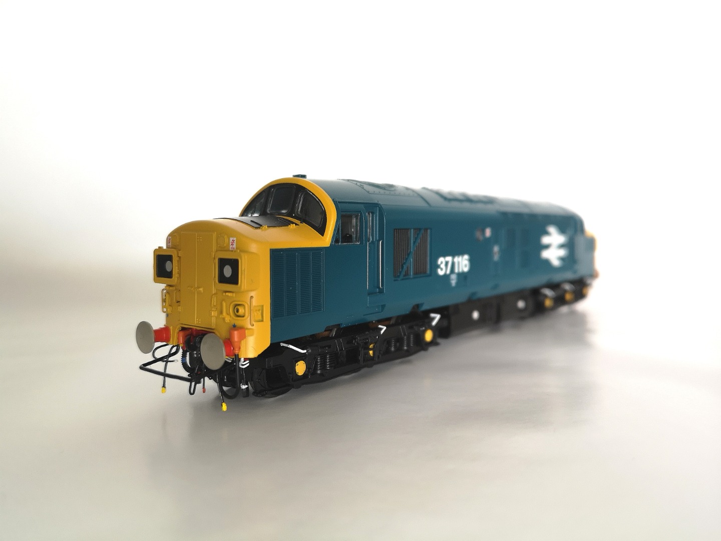 37116 was a long term Stratford machine, having been transferred there in January 1975. In 1987 the loco was treated to a fresh paint job and a unique livery, being displayed at Norwich Crown Point open day on 30/05/1987 ( Class37.co.uk ) in a striking variation of BR 'Large Logo' livery, whereby instead of having full wrap-round yellow ends and a grey roof, the loco simply sported a yellow bonnet and front window surround. The livery was embellished with the Stratford 'Cockney Sparrow' motif. I have a soft spot for unique livery variants and so this GE machine was another must for my collection.