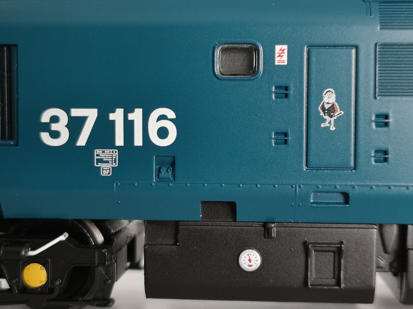 The air and main res pipes were Hornby parts, being a much finer representation than their Bachmann counterparts. Interestingly, much like 37003, there was a discrepancy between boiler and bufferbeam attachments; in this instance 37116 was still fitted with its boiler, but this had been isolated on 18th February 1983 and as such there was no steam heat pipe present.