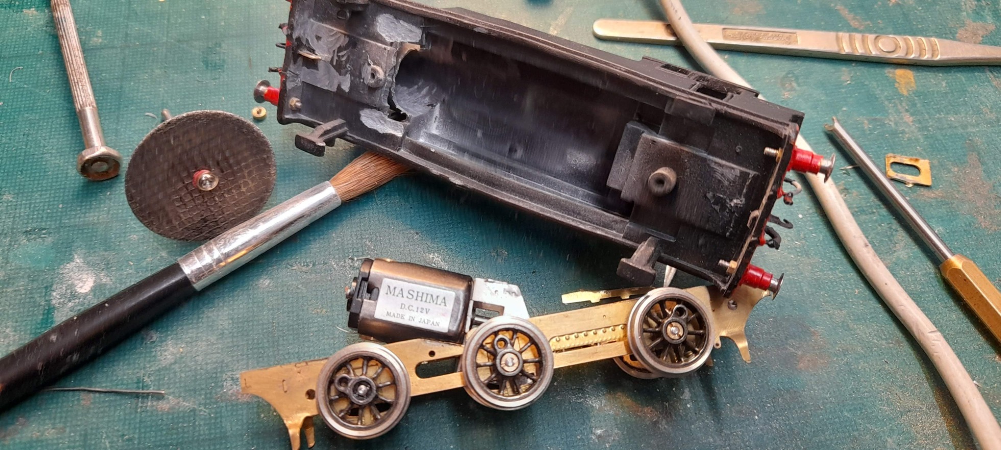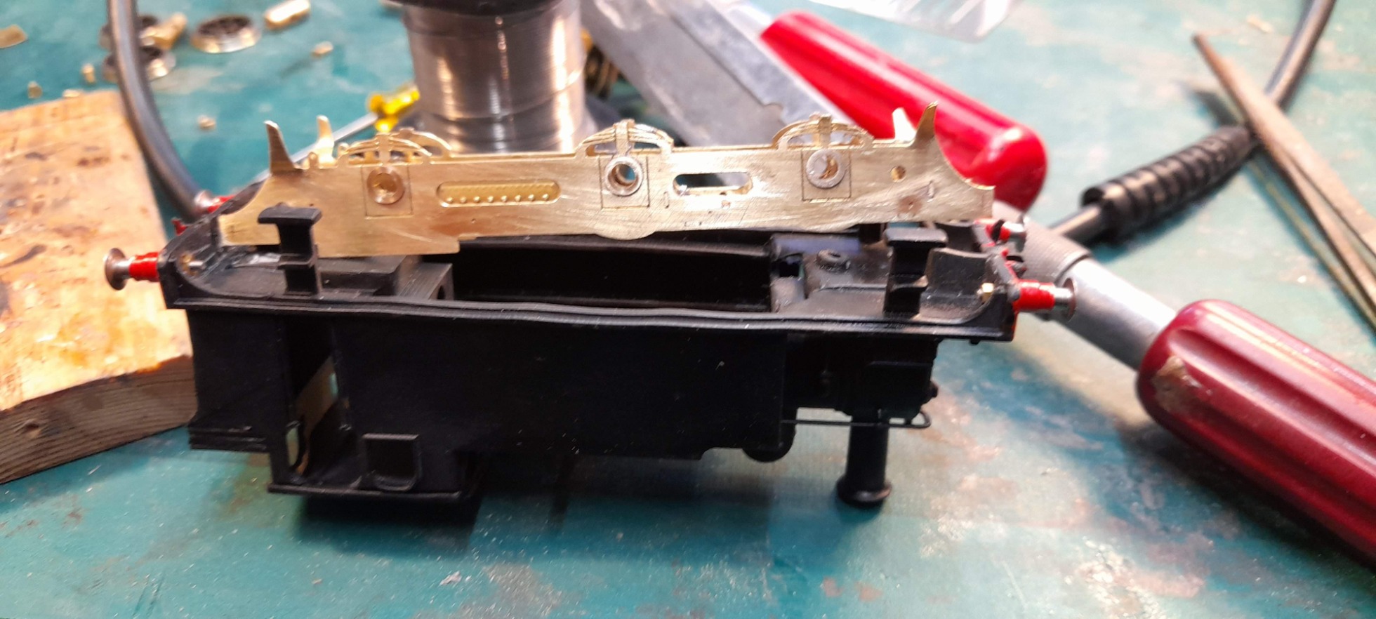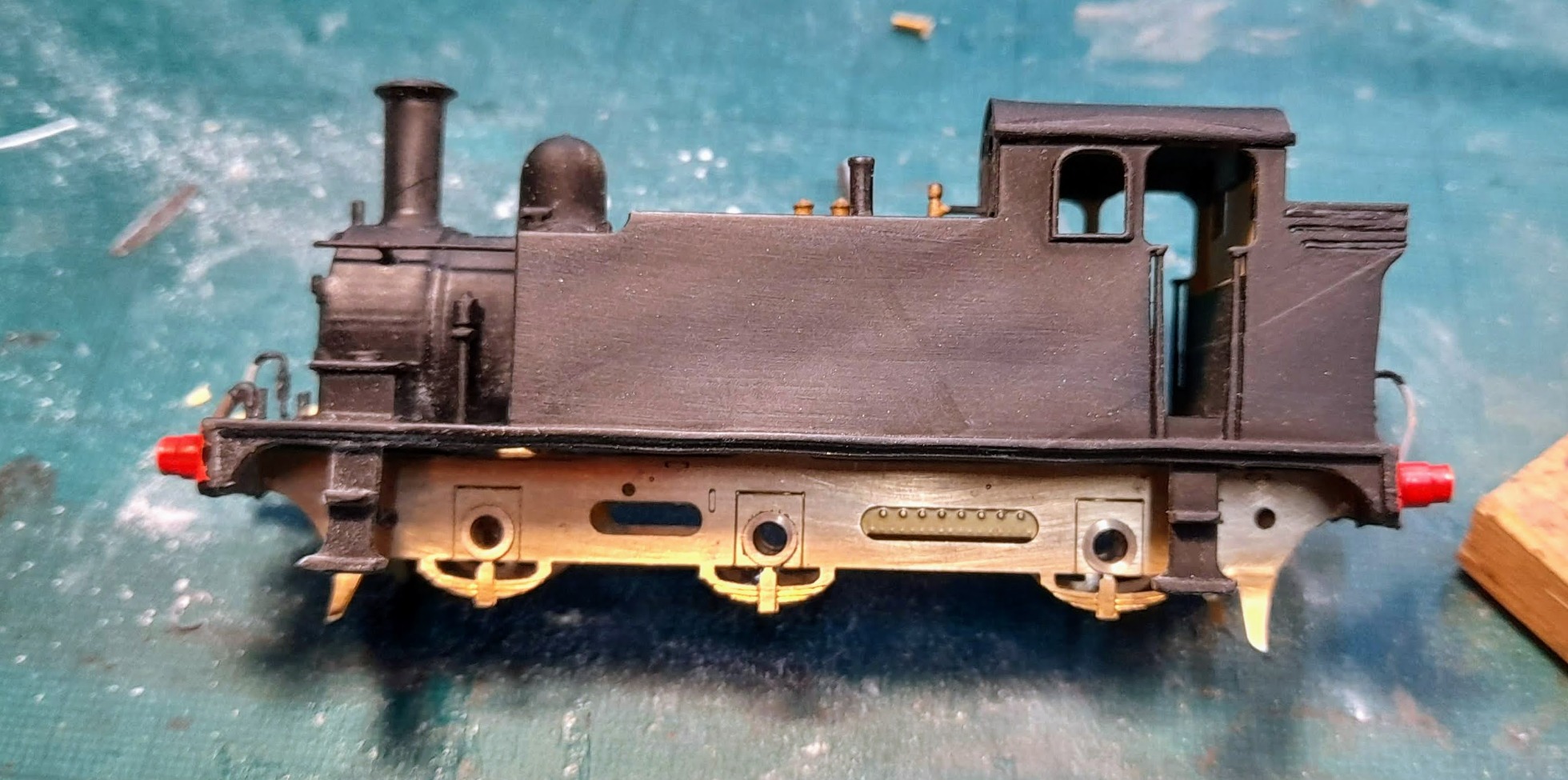 The SEF chassis is designed for their etched brass body and for the motor to drive a rear axle. After much “faffing” that did not work for the 3D body. Therefore, a slight alteration to the frame – you can see where I had to cut the frame to fit the motor - and inside of the smokebox had to be carried out to enable the motor to fit and drive to centre axle. A small amount of filing to get the chassis and body to sit level – or at least level to my eye – is necessary and the photos show where I had a “fiddle”.