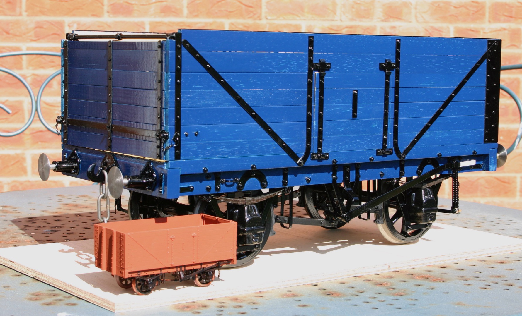 Now for something slightly larger. I never expected to get into live steam, I not sure I even knew it was a hobby until an experienced model engineer came to work with me in about 2000. We got chatting about trains and he showed me his 5” Britannia and then current project to build a Standard Class 4 tank loco and before you knew it I was setting up a little workshop and making a start on a GWR tank loco because I didn’t think the only GER design readily available would be powerful enough which was the Y4! Moving on after few years of slow but steady progress due to lack of skills and equipment followed by redundancy the loco got put on hold for a bit and I built an RCH 7-plank mineral wagon from an unmachined but complete kit in order to have something completed to take to events. Shown below with a 7mm scale wagon for scale.
