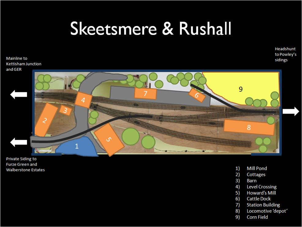 To explain the name, if the Middy extended north from Horham towards the Waveny valley line and Harleston the last place of any note it might have passed through would have been the hamlet of Skeetsmere and the village of Rushall (the Middy had the habit of putting the name of the smaller place first on their signage) and here as with the fate of this madcap railway my premise is that it ran out of money not able to reach its goal that is very much in sight…. Hence the need for the engine shed and terminus station