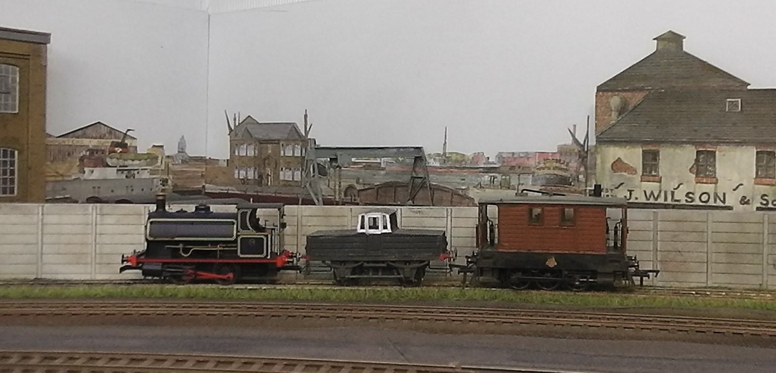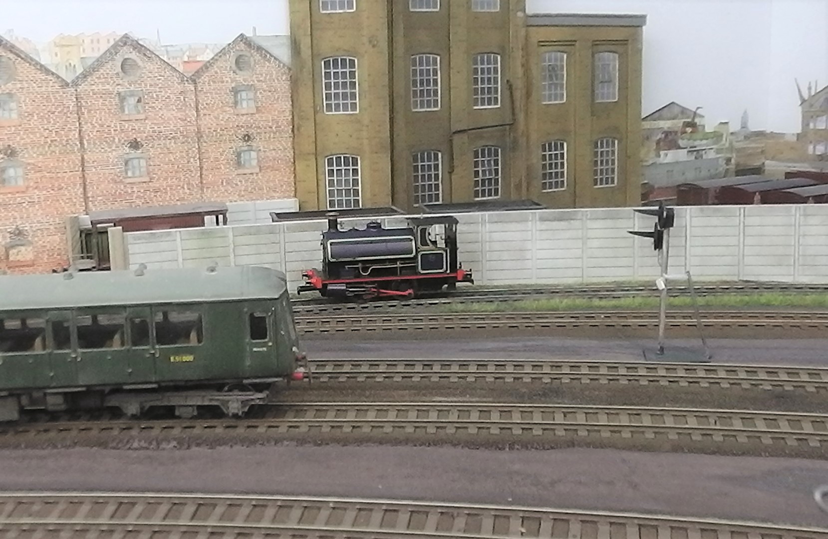 I could not resist this little PLA Peckett by Hornby. As this station could well have been near the River Lea tidal basin, I created a hint of a dock in the corner of the layout by using a commercial backscene and creating a dock wall inspired by that which once stood opposite Custom House station. The tail end of a home brewed Lea Valley DMU is seen passing.