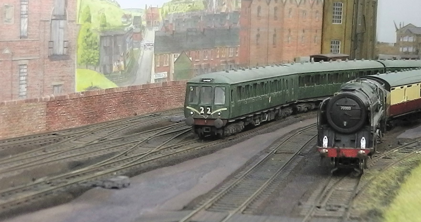 The stretch between Bethnal Green and Hackney Downs is of four tracks. The fast lines bypass the stations at Cambridge heath and London Fields. I have sought to reproduce this arrangement, albeit not on Viaduct. Here 70000, Britannia, (Hornby) overtakes a Lea valley DMU as it slows to a stop at Bow Locks.