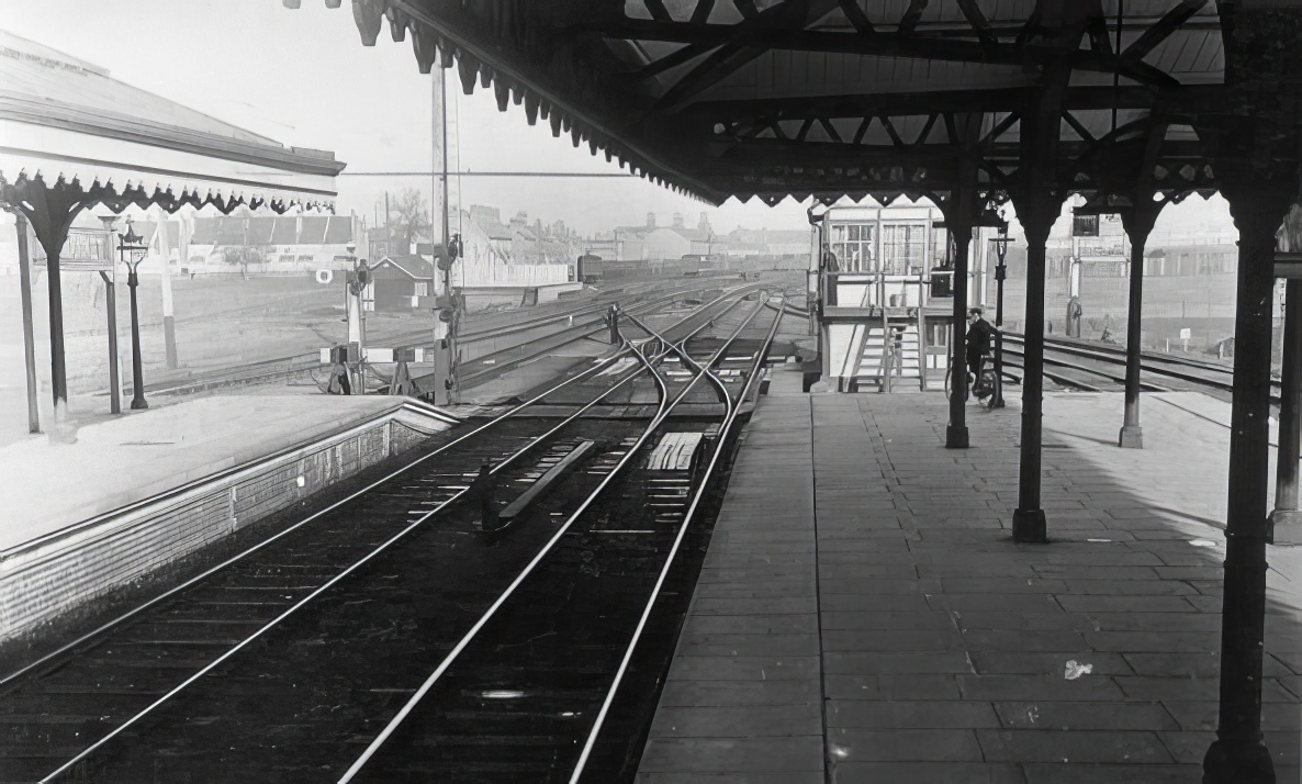 Newmarket. Of particular interest is what is on the bridge: maps mark the bridge as having the cattle dock on top of it. It would have been just to the right of the low starter signal near the centre. Beyond that were the main storage sidings, and the siding for the maltings. The platform was famously wide to accommodate race-day traffic.