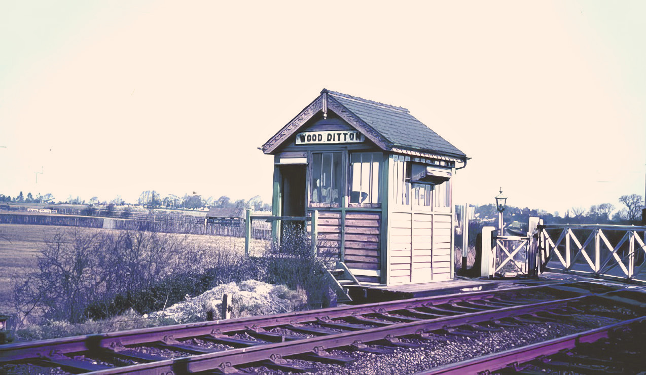 Wood Ditton Level Crossing. Wood Ditton is the parish in which Newmarket station was built, and stretches south and west from Newmarket town. The photo shows the level crossing of the B1061 with the railway, which was elevated about 10' above the surroundings. The fields behind were for racehorse paddocks. Newmarket New was about 2/3 mile to the right.